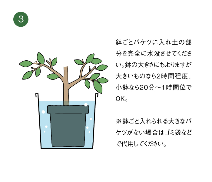 ②水は鉢底から出るまであげているけど、土に浸透するよりも早く、鉢底からお水が抜け落ちているような水やりの仕方をしていませんか?さっと水が下に抜け落ちてしまっている場合はコーヒーをたてる時のようにゆっくりと水をあげてください。徐々に土に水が浸透し、奥深くの根にまで水が行き渡るので同じ量をあげても内容が全く異なります。鉢の構造上すぐに抜け落ちてしまう場合は受皿に水を数センチ溜め、30分くらい水につけてください。その後は必ずお水を捨ててください。